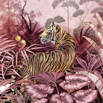 De Caspian Jungle muurschildering in Mulberry zit boordevol prachtig rijke en levendige magenta tinten. De roze tinten van het gebladerte omhullen je als een warme knuffel. De licht blozende lucht wordt langzaam dieper terwijl je blik afdaalt naar het rijke moerbeienjamkleurige jungletafereel, waar een tijgerin ontwaakt en geschilderde ooievaars zich voeden met fruit tussen de bloemen. Bestel nu en breng je muren tot leven!
