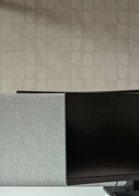 Het ontwerp met zijn zachte, grafische lijnen en neutrale haverkleur brengt een moderne rust in het kantoor. Het doorbreekt de strakke muren zonder af te leiden, waardoor een professionele maar warme sfeer ontstaat die essentieel is voor een prettige werkplek.